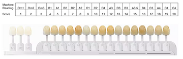 The Vita Easyshade spectrophotometer is a handheld probe device widely used for determining tooth shade color. The machine readouts were measured in triplet and the mean was taken for each subject visit. Conversion of Vita units to mathematical scores we performed are shown below: